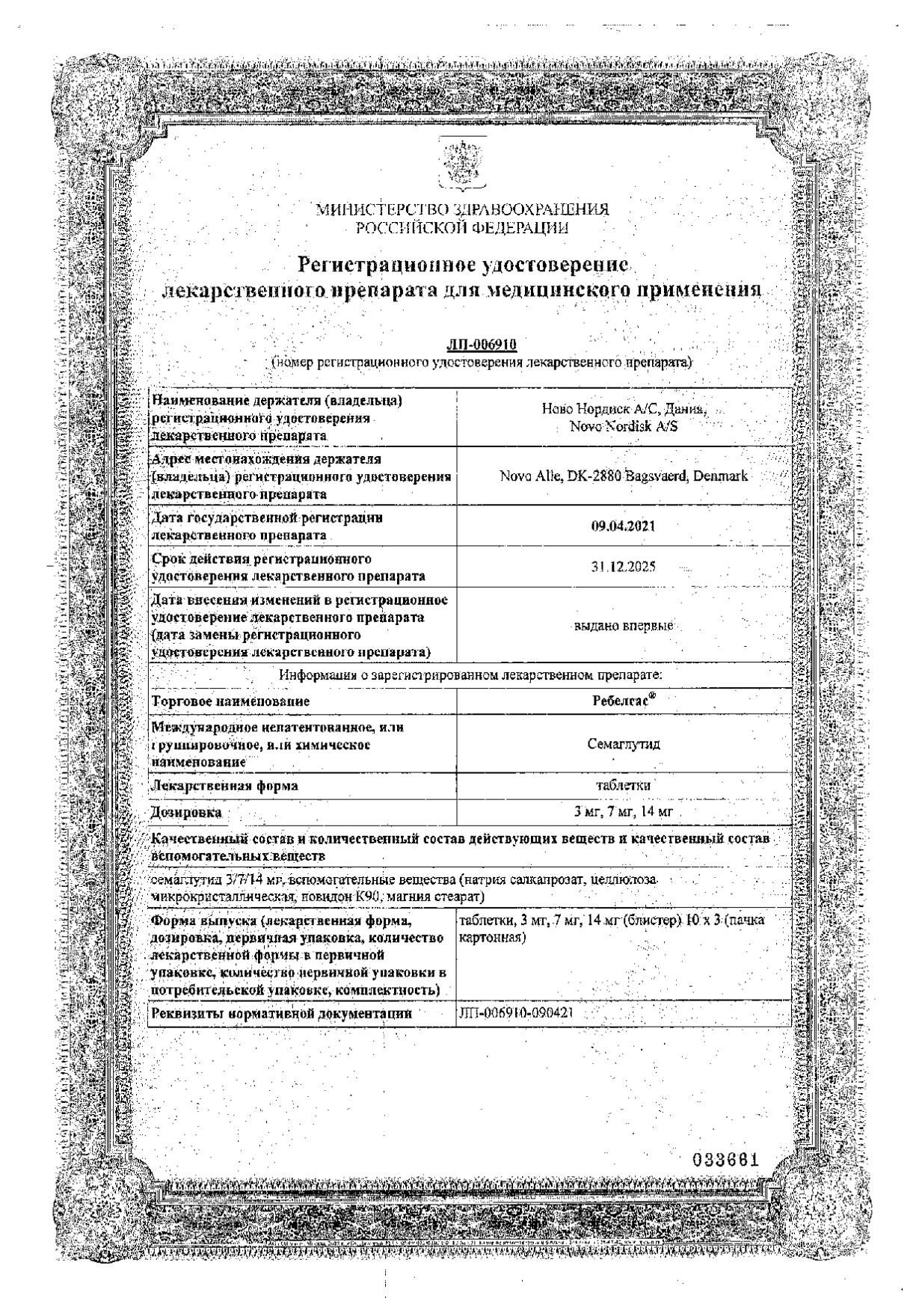 На терапии препаратом Ребелсас® 3 мг, 7 мг, 14 мг в течении 26 недель было получено статистически значимое снижение массы тела на 1,4 кг, на 2,4 кг и на 3,7 кг против снижения на 0,4 кг в группе плацебо (р< 0,05, р< 0,001, р< 0,001 соответственно дозе).
