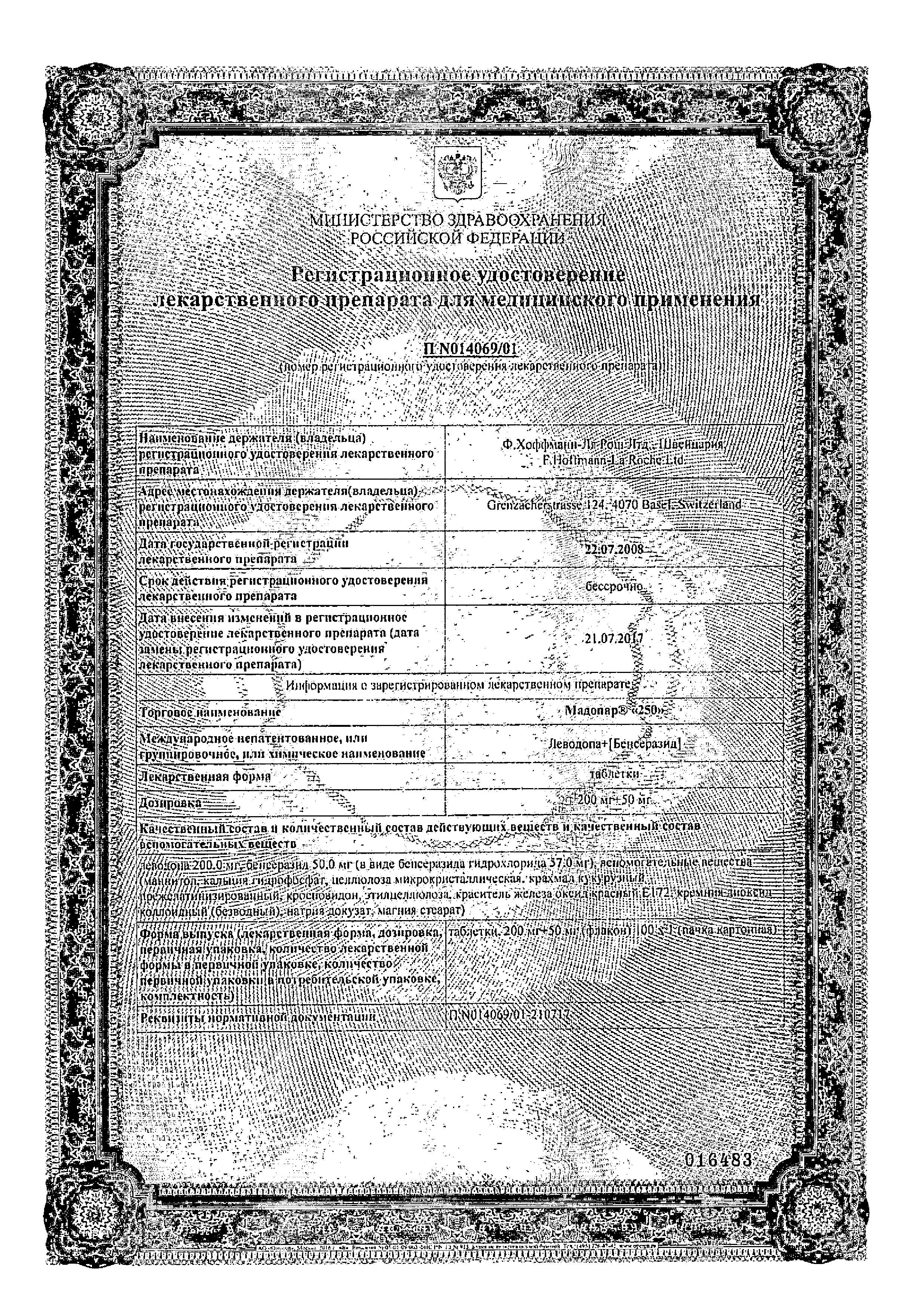 Капсулы Мадопар® "125" и таблетки Мадопар® "250". Леводопа и бенсеразид всасываются главным образом в верхних отделах тонкой кишки. Cmax леводопы в плазме достигается приблизительно через 1 ч после приема. Абсолютная биодоступность леводопы в среднем составляет 98% (74-112%). Капсулы и таблетки Мадопара биоэквивалентны.