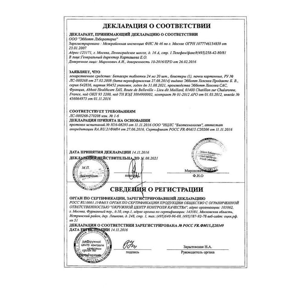 Бетасерк отпускается из аптек при предъявлении рецепта от лечащего врача.