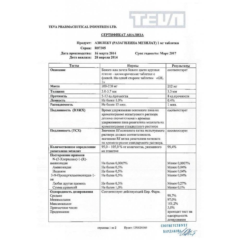 Препарат Азилект содержит активное вещество: разагилина мезилат 1,56 мг (эквивалентно 1 мг разагилина основания).