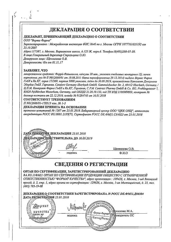 1 капсула Ферро-Фольгамма содержит активные вещества: железа сульфат 112,6 мг (соответствует 37 мг иона железа), фолиевая кислота 5 мг, цианокобаламин 0,01 мг, аскорбиновая кислота 100 мг.
