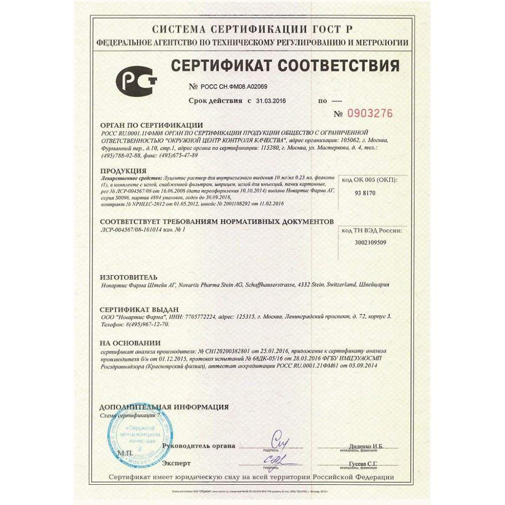Показания. Луцентис назначается для терапии влажной макулодистрофии и хориоидальной неоваскуляризации. Оправдано купить Луцентис для лечения зрения при диабетическом макулярном отеке, а также для лечения зрения при неправильном кровообращении в области сетчатки.