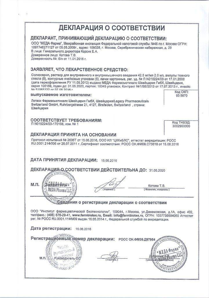 Хроническая венозная недостаточность, сопровождающаяся трофическими нарушениями: в/в по 10 мл 3 раза в неделю. Длительность терапии составляет не более 4 недель и определяется клинической картиной заболевания. При наличии местных трофических нарушений тканей рекомендуется одновременное проведение терапии препаратами Солкосерил гель, а затем Солкосерил мазь.