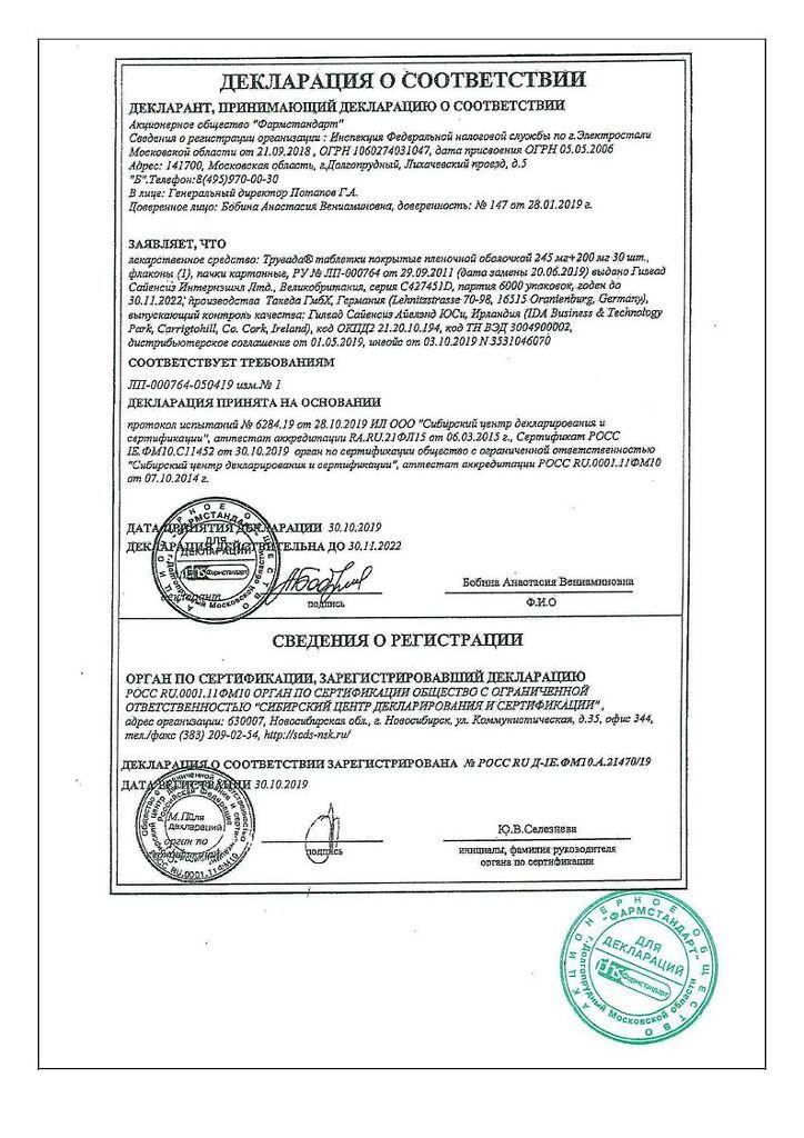 1 таблетка содержит 300 мг тенофовира дизопроксила фумарата, что эквивалентно 245 мг тенофовира дизопроксила